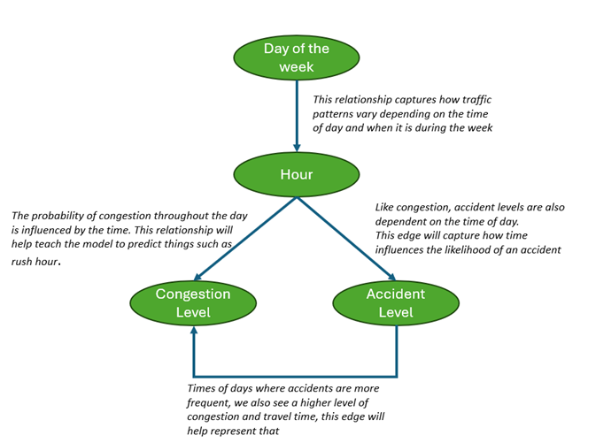 - Accident Level is depended on Hour: Like congestion, accident levels are also dependent on the time of day. Certain times such as late at night on the weekend might be more accident prone. This edge will capture how time influences the likelihood of an accident.